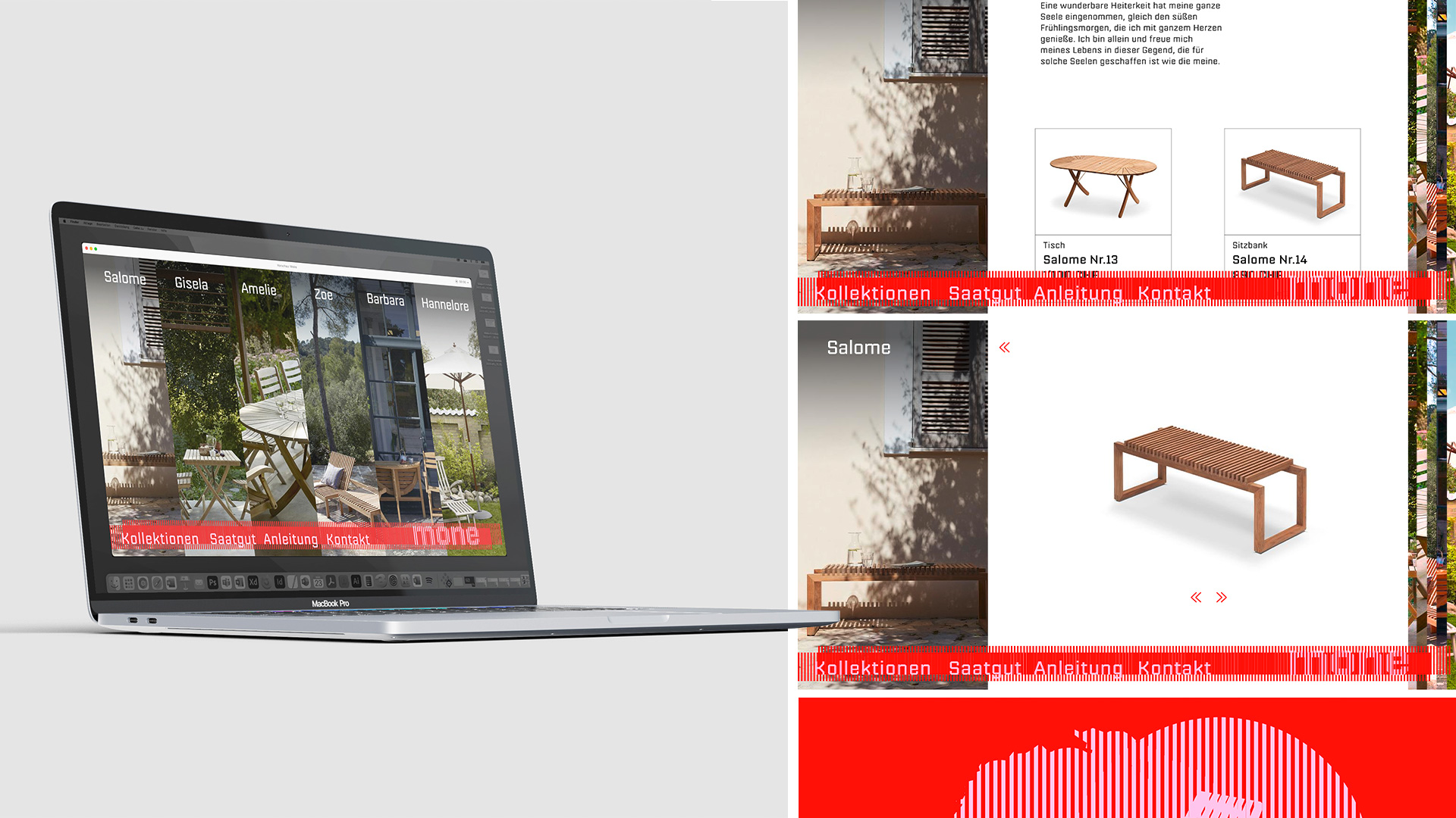 Ich durfte für Mone das Konzept sowie den gesamten Auftritt der neuen Firma gestalten. Das Ziel des Auftritts: sichtbar zu machen das Mone eben nicht nur eine Gartenmöbelfirma ist, sondern hinter jedem neu gekauften Möbel auch gleich eine neue Pflanze steckt.